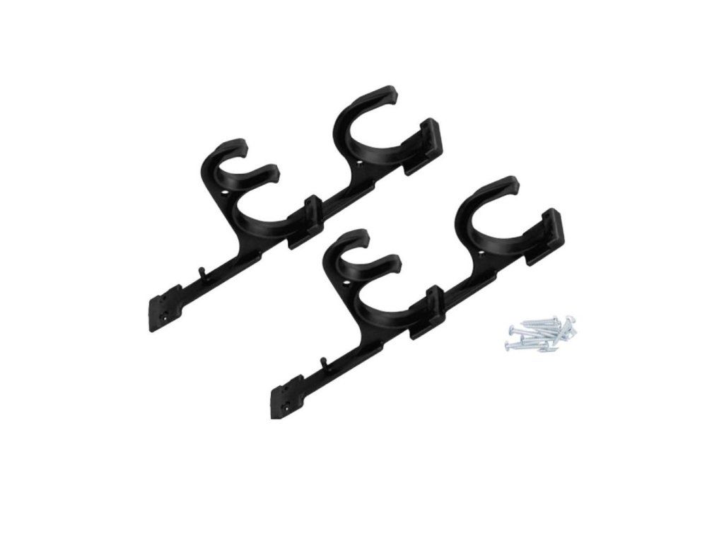 Praktický závesný držiak z čierneho plastu na bazénové hadice a teleskopickú tyč chráni toto bazénové príslušenstvo pred poškodením počas skladovania v období mimo kúpacej sezóny.