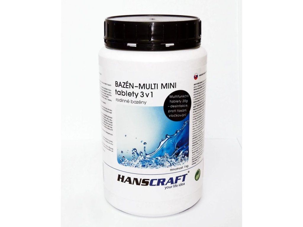 HANSCRAFT BAZÉN - MULTI MINI tablety 3 v 1 Multifunkčné 20g tablety sú určené na pravidelnú dezinfekciu bazénovej vody s viacúčelovým použitím - zabezpečia dezinfekciu, zabránia vzniku rias, odstránia nečistoty pomocou vločkovania. Spôsob použitia prípravku: Prípravok 3v1 zabezpečuje dezinfekciu bazénovej vody pomocou pomaly sa uvoľňujúceho chlóru, prevenciu proti tvorbe rias, napomáha odstráneniu mikroskopických nečistôt pomocou flokulácie. Použitím tejto 20g tablety možno ošetriť vodu v bazéne o veľkosti 3 m3 na 5-7 dní pri bežných podmienkach. Návod na použitie: Tableta sa dávkuje do skimmera, nesmie prísť do priameho styku s obkladmi, stenou a dnom bazéna, aby nedošlo k ich odfarbeniu. Frekvencia dávkovania: Pri pravidelnej prevádzke 1 tableta na 3 m3 vody každých 5-7 dní.