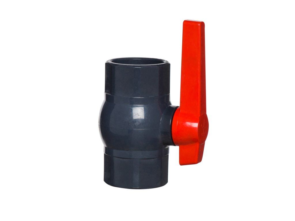 Kompaktný guľový ventil PVC-U s dvoma skrutkovacími závitovými spojmi z nemäkčeného šedočierneho polyvinylchloridu PVC-U a červenou ovládacou pákou slúži na reguláciu prúdenia kvapaliny v potrubných rozvodoch v mieste, kde je potrebné príležitostne zastavovať tok kvapaliny v potrubí. Inštalácia kompaktného guľového ventilu do potrubia sa vykonáva pomocou dvoch skrutkovacích závitových spojov, utesnených vhodnou tesniacou páskou. Poloha červenej ovládacej páky ventilu je v šedočiernych potrubných rozvodoch na prvý pohľad jasne viditeľná a jej pozícia (otvorené/zatvorené) spoľahlivo identifikovateľná. Termoplastický elastomér na báze polypropylénu, z ktorého je vyrobené sedlo ventilu a uzatváracia guľa, svojimi vynikajúcimi mechanickými vlastnosťami zaručuje hladký chod ventilu a perfektnú tesnosť. Výmena či demontáž jednotlivých dielov guľového ventilu nie je možná, ide o kompaktný armatúrny diel. V tejto kategórii nájdete kompaktné guľové ventily s dvoma lepenými spojmi v širokom spektre rôznych priemerov (20mm až 110mm), vždy v tlakovej triede PN16.