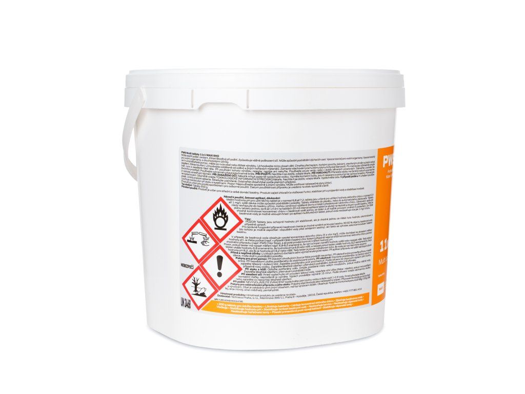 - Prejasní vodu a zabráni prípadným problémom s tvrdosťou -Multifunkčné tablety do bazéna 11v1 obsahujú prísady, ktoré napomáhajú stabilizovať ióny vápnika a horčíka tzv.tvrdosť vody. Kapacita týchto tablet je však obmedzená a v niektorých prípadoch, keď napúšťacia voda Vášho bazéna obsahuje vyššie koncentrácie minerálov (zvyčajne v prípade použitia studničnej vody), je nevyhnutné použiť prípravok Zníženie tvrdosti(to platí iba v prípadoch, keď je voda veľmi tvrdá, orientačne nad hodnotu cca 5 mmol/l).