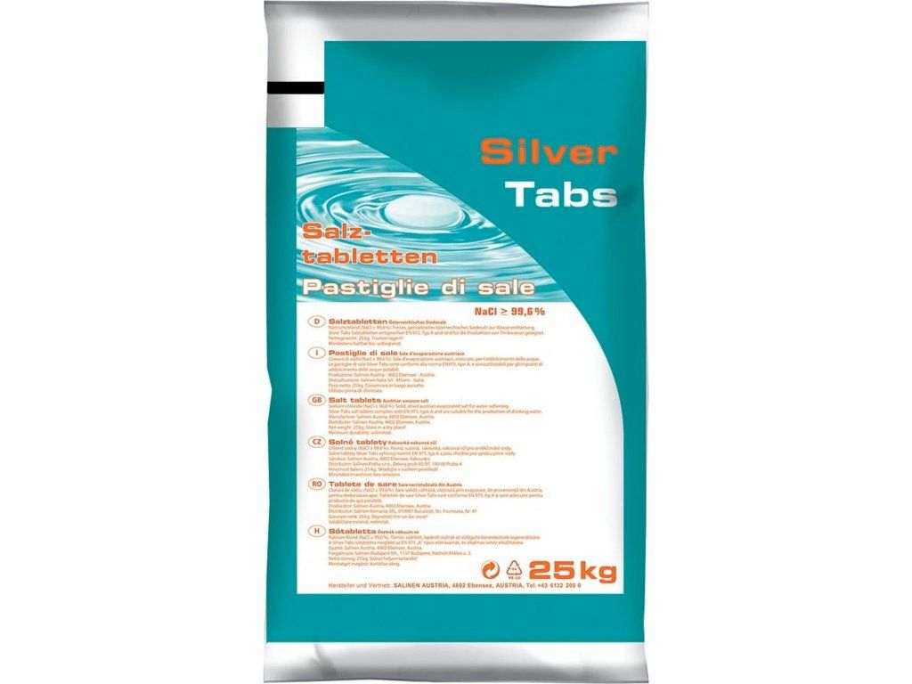 Tabletová regeneračná soľ 25 kg Silver Tabs je kvalitná rakúska soľ, ktorá je považovaná v rámci celej Európy za špičkovú tabletovú regeneračnú soľ. Soľ používaná na výrobu tabletovej soli Silver Tabs vychádza z jedlých solí, ktoré spĺňajú najprísnejšie kritériá kvality potravín. Vysoká kvalita tejto rakúskej tabletovej soli zabezpečuje kvalitnú a dlhodobú prevádzku vašej zmäkčovacej kolóny.