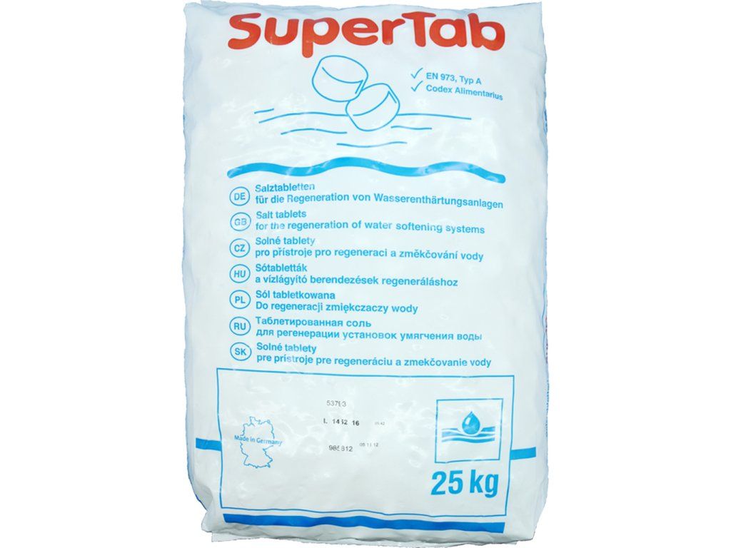 Tabletová regeneračná soľ SuperTab 25kg je kvalitná nemecká soľ, ktorá sa považuje v rámci celej Európy za najkvalitnejšiu tabletovú regeneračnú soľ, ktorú je možné zakúpiť za takto výhodných podmienok. Soľ používaná na výrobu tabletovej soli Supertab vychádza z jedlých solí, ktoré spĺňajú najprísnejšie kritériá kvality potravín. Vysoká kvalita tejto nemeckej tabletovej soli zabezpečuje kvalitnú a dlhodobú prevádzku vašej zmäkčovacej kolóny.
